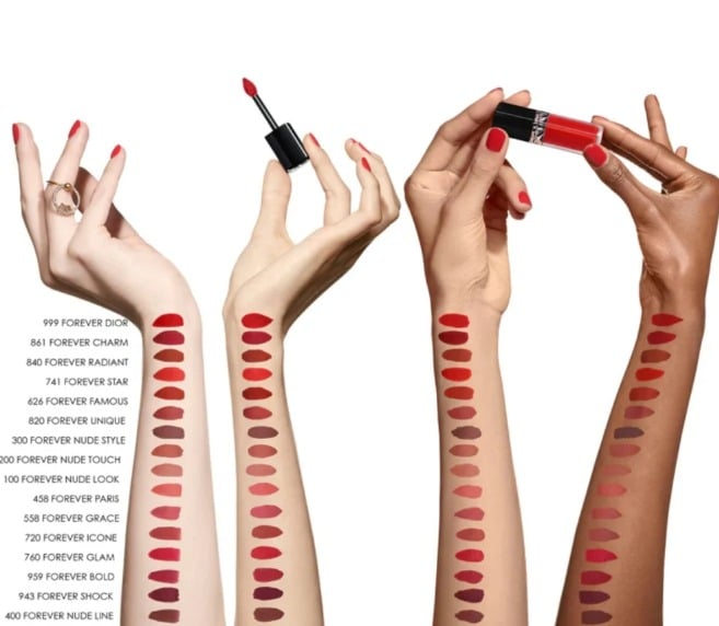 يأتي روج ديور فور إيفر ليكويد بمجموعة من الألوان الراقية والجميلة التي تتناسب مع جميع الإطلالات، من الألوان الجريئة إلى الألوان الهادئة.